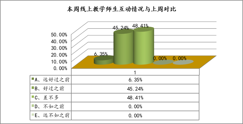 教学督导反馈(见图20),本周任课教师通过随机提问、点名发言、课堂讨论等多种方式增加与学生的互动,提高学生学习积极性和能动性。45.24%的课堂互动超过前三周,有6.35%的课程互动超过前三周。在线上教学互动难开展的情况下,教师在本周下了“狠功夫”,不断提高课堂的互动效果。