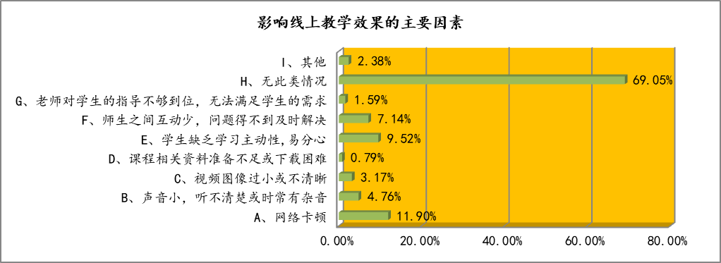 如图17所示,本周在线上课程教学运行平稳,影响线上教学成效的不利因素比上周减少了4.88%,连续两周都在下降;学生学习积极性也提高了5.61%,师生间互动,问题及时解决方面提升了3%,网络卡顿的现象也比上周降低 4%。本周影响教学成效的因素,主要是网络卡顿、学生缺乏学习主动性。