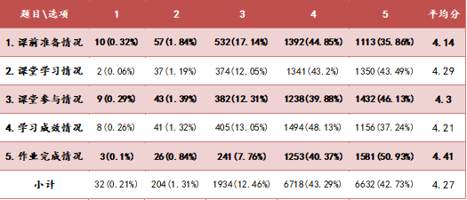 经过一个月的线上学习,绝大多数学生能逐渐适应线上教学模式,根据教学信息员对自己及班上同学的学习情况自评显示,学生对自己在作业完成情况这一环节自评分数较高,达到4.41分,过半的课程作业能很好的完成,依次是课堂参与(4.3分)、课堂学习(4.29分)、学习成效(4.21),对于课前准备这一要求学生有较强自主学习能力的环节自评4.14分,任课教师应继续引导学生开展课前预习,进一步提高线上教学的学习成效,让学生拥有更强的“获得感”。