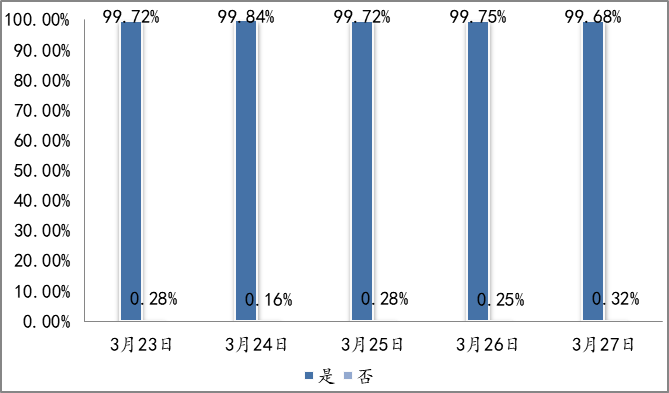 学生教学信息员提供的反馈数据显示(见图36),本周任课教师准时开课率为99.74%,与前两周基本持平。一个月以来,除了第一周因平台卡顿、调试及师生使用熟悉程度等造成的影响,教师准时平均开课率为99.67%。