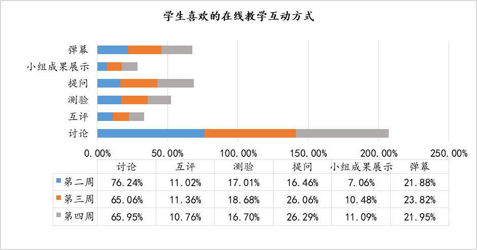 对于线上课堂互动教学方式,从近三周的学生反馈情况来看(见图29),在讨论、提问、弹幕、测验、互评以及小组成果展示等几种互动方式中,学生最为青睐的是讨论,第四周学生喜欢讨论的占比达到65.95%。。