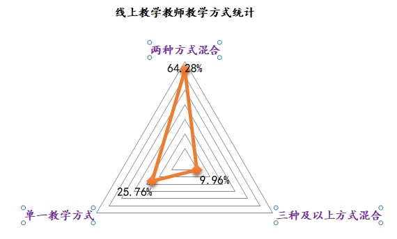 经过四周的线上教学,教师们采用了多样化的教学方式,其中包括直播教学,录播教学,SPOC 教学,线上研讨教学,学生自主学习等。根据反馈的数据显示(见图27),64.28%的教师在同一门课程中能够采用两种教学方式进行线上授课,9.96%的教师在同一门课程中能够采用三种及以上教学方式进行线上授课,采用多种教学方式的辅助,而不仅仅是使用单一的教学方式,在课堂上能更加激发学生的学习兴趣,活跃课堂气氛,提升线上教学效果。
