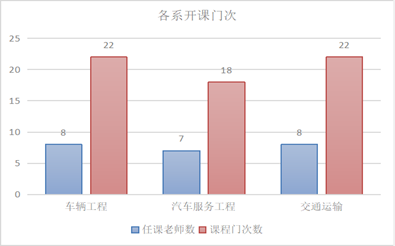 第四周,汽车与交通工程学院应开专业理论课程开课62节次,开课率100%,上课班级数28个,任课教师为23人,参与线上学习的学生数864人。各系部任课老师人数和开课节次数如图1所示,各课程线上教学开展顺利,教学运行状态良好。