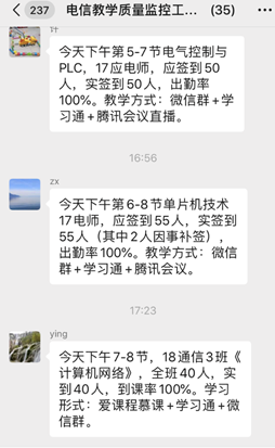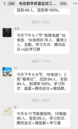 3月23日至3月27日,电子与信息学院共开展70门线上课程,累计23个班级参与学习,学生到课率基本到达100%。全院教师在线上课堂上做到了五个“有”:上课有课件、问题有讲解、师生有互动、课后有作业、线上有考勤,通过这种方式保障线上教学质量,增强学习效果。授课教师课后在学院教学工作群汇报教学考勤及授课情况,让学院教学质量小组实时掌握在线教学动态。总的来看,经过一段时间的线上教学,全院师生普遍掌握了相关线上教学平台的功能和使用技巧,已经适应了线上教学的相关流程。