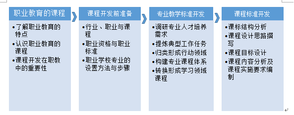 在这个框架中,前两部分为基础,第一部分“绪论-职业教育的课程”主要让学生端正对职业教育及职教课程的认知,第二部分“课程开发前准备”旨在让学生了解与课程开发密切相关的专业术语及其在课程开发中的作用。后两部分为本课要求学生重点掌握的课程开发技能,学生完成学习之后就能够产出一个专业教学标准和一个课程标准。