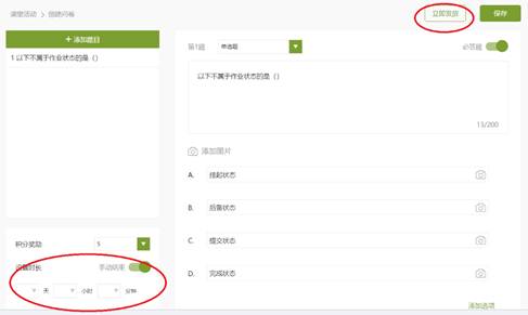除了发布问卷外,抢答也是一项有助于增加在线课堂互动性的活动。课中,老师可根据课堂进度,适时在学习通平台发布课中抢答,发布前可调整积分奖励、有效时长等,如下图14。学生收到学习通平台通知后,可直接点击抢答,抢答方式和课中测验类似,如图16。
