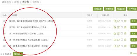 超星学习通平台提供的作业库功能,可让老师在课前提前创建课程作业,并在课程结束后,手动或由系统自动将作业发布给教学班级的所有同学,如下图8所示为课前老师在作业库中提前创建的课程作业。此外,通过学习通平台,学生可直接在线上完成作业并提交,老师亦可直接在线批改作业,并导出作业完成情况,非常高效便捷,如下图9所示为已发布作业的完成情况总览,通过查看每一次作业,还可以分别导出作业完成情况相关统计信息。
