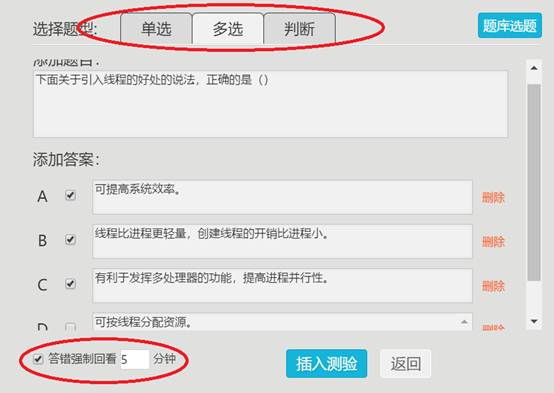 本课程主要通过插入测验,加强所录制教学视频的互动性。插入测验的内容有多种,如单选题、多选题和判断题,如下图5。插入测验题时,可选择当答题错误时,强制回看视频若干分钟,以让学生通过回看视频掌握相关知识点。