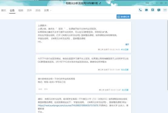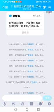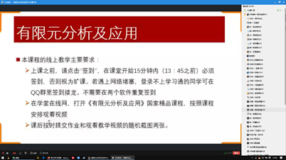 使用学习通平台进行签到考勤,严抓课堂考勤纪律。为避免学生因网络堵塞登录不上学习通平台签到,在QQ群内发起接龙签到的活动。同时,上课期间可在QQ群内发起QQ直播课堂语音,可以随时监控学生是否按时到场学习。