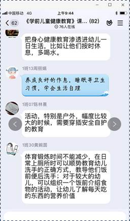 在线上教学组织管理方面,我院老师坚持提前发放教案、录播视频、学习任务和要求等教学资料,上课期间充分利用各教学平台、QQ群、微信群的功能,设计了多样化的互动交流形式,课堂卡顿现象也大大减少;课堂上主要采用互动、答疑、随堂测验等教学模式,最大程度地减少了网络拥堵,充分发挥了学生的学习主动性,尽最大可能地实践着“翻转课堂”等新教学模式。例如,学前教育系孙文云老师担任2019级学前1、2班周二上午1-3节的《学前卫生学》课,她按照以往提前10分钟开始在学习通签到,时间是20分钟。由于前几周,每次下课后总有没按时签到的学生找理由,经过跟学生沟通后,除已登记没有网络的同学外,其他同学没有在规定时间内签到的一律按迟到或旷课记录。学生这周的签到基本正常了。由于19级新生接触新的专业课,加上在线学习,孙文云老师担心学生不认真学习,因此每次上课前都会有小测试,在本周则设置了抢答活动。课程设置以基本概念、基础知识为主,密切结合生活、幼儿园实际的案例进行分析,学生易于理解。