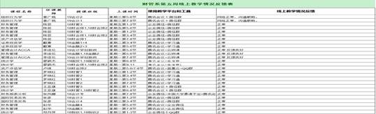 财经学院线上教学开课50门(含管理学院的经济学、会计学、微宏观经济学3门课程)申请延迟开课3门(会计综合实训、会计信息系统、微观经济学)。使用腾讯会议43门次,腾讯课堂30门次,学习通25门次,企业微信30门次,慕课8门次,QQ群课堂6门次,钉钉4门次,SPOC 1门次,录播2门次,学习强国视频 6门次 云班课6门课。由任课教师、教学信息员、系主任、学院督导组组成的四层教学质量保证体系继续履行督导职责,任课老师课中严格管理,继续通过各种灵活方式监督学生课堂学习,教学信息员按要求及时反馈学生学习具体情况,系主任、学院教学督导按要求完成听课任务。