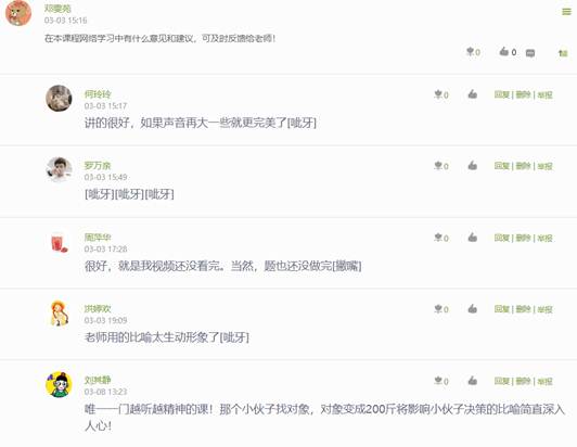 3.当然在教学过程实施中还发现了一些不足亟待解决,在群聊课过程中,由教师抛出问题,积极活跃的学生能够参与到讨论中来,但是有些基础薄弱的学生参与度较低。改进措施:一个是更明确奖励方案;另一个是在课程中,可以点名提问2-3名不同层次的学生,针对性的给出难易度不同的问题;还可以通过设立学习小组,让学生可以互相学习和督促。
