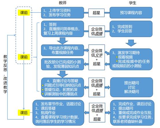 课中采用企业微信直播+超星学习通结合的教学方式,企业微信主要实现直播和文字交流答疑,超星学习通实现课堂的活动,尽量避免使用过多软件导致学生频繁切换,同时又能做到学生课堂随时找得到老师,老师也能监督到学生学习的过程。课堂教学环节主要包括:考勤、直播导入课程、观看录播视频、直播进行课堂活动及答疑。