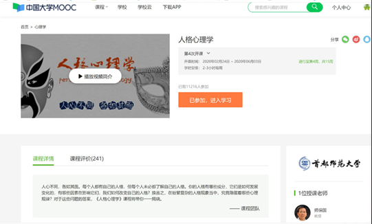 根据教育部“停课不停教,停课不停学”的要求以及太阳集团相关教学安排,在线教学成为本学期前期的主要教学方式。优质的线上课程资源和授课平台是保障课程顺利开展和学生学习效果的前提。本课程甄选了中国大学MOOC平台首都师范大学师保国教授主持的《人格心理学》作为线上教学视频学习资源。其课程体系与本课程一致,凝缩了人格心理学各流派的核心观点,以微视频的形式呈现核心教学内容,是非常优质的学习资源。