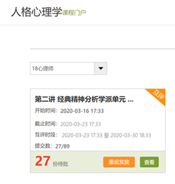 本课程通过课前构建引导性主题讨论、观看国家精品课程视频资源,课中聚焦知识点讲解、现场案例讨论、线上交流,课后小组合作式学习、以测促学的方式推动学生通过预习、听课、完成小组作业、进行在线测试等方式掌握课程核心知识点并具备较强的人格分析实操能力。本学期2018级应用心理学专业(师范)1、2班共87位同学参与本课程的学习。