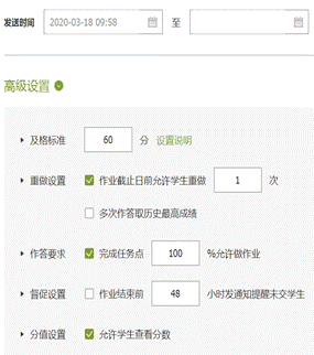 教师根据教案中的重点和难点,针对每次课的教学内容设计课后自测题,从而检验学生自主学习课程视频任务点的效果。题型包括客观题和主观题,具体有单选题、多选题、判断题、简答题和论述题等,总分为100分。教师在学习通平台上将课后自测题以作业的形式发布,可以设置作业提交的截止时间、及格标准、作答要求、防作弊等,如图5所示。