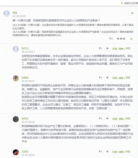 例如第一次课的讨论主题是“新冠肺炎疫情对企业人力资源规划的影响”,有90多名同学在讨论区里积极的回复,引爆了话题。同学们都结合查阅的网络资料分析,也列举了很多企业应对疫情带来影响的案例。教师和学生都可以在讨论区里发言、点赞、回帖,充分体现了教学活动的“交互性”和学生自主学习的热情,如图7所示。