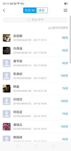 通过学习通的学情统计表明,前六周2个班99名学生的平均按时签到率为98.5%,章节视频平均完成率为100%,课后自测题完成率为100%,自测题平均分为90.4分,达到了教师在线教学活动设计的理想效果,体现了学生学习的高度“自主性”和“参与性”,见图9和图10。