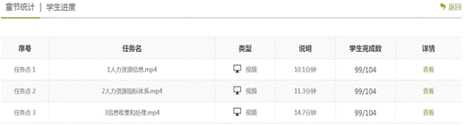 由于《人力资源战略与规划》是人力资源管理专业的专业模块课,专业性和实践性较强,所有慕课平台中都没有合适的资源,教师只能自建课程资源。根据教学大纲和教学进度表,教师每周录制30分钟左右的课程内容“干货”授课视频,对知识的重点和难点讲解透彻(见图2)。再将录制好的视频分成三部分上传至超星平台,作为学生必须完成的任务点,并可以在后台监测到学生完成的进度,如图3所示。