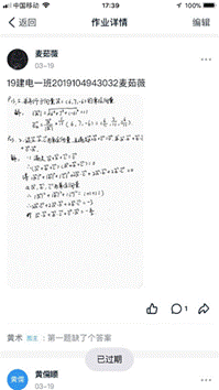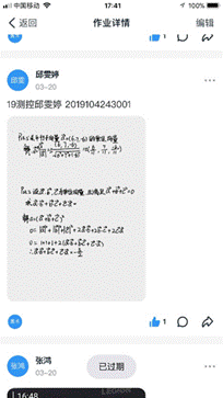 课后,教师把上课及复习用课件通过微信群发给学生,以便学生复习。作业每周布置一次,教师在钉钉作业平台发布本周作业,学生登录该平台,完成有关作业并在线提交。每周的作业提交截止时间为周六晚12时,过时不补,这样可以培养学生的时间观念及良好的学习习惯。教师通过点赞或评论等方式批改作业,并作登记,作业将在本章习题课上集中讲解。
