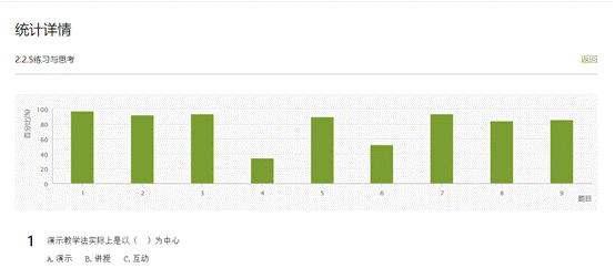 为了增强学生的参与感,在课程中不断进行随堂互动测试,并进行评价,提出各种小的问题与小的作业,鼓励学生参与课堂中小知识点的测试与评价。这种评价多以小知识点或者小题的形式出现,每次1-2个题,学生能迅速做出应答。测试结果如图9所示。