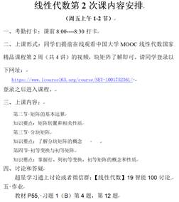 然后,发布了与教材配套的国家精品课程,中国大学MOOC视频学习网站“东南大学——《线性代数》”和学习要求,要求同学们按照教学进度表,在上课前完成视频学习和练习,如图3所示。需要特别指出的是,为了监控同学们的学习效果,这个环节需要同学们每周提交一次学习笔记作为考勤。未提交学习笔记的同学,需要针对本周的学习内容至少提一个相关的问题。
