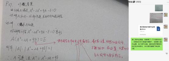 课后自主学习环节是疫情防控期间,我们所有课程不可缺少的环节。《线性代数》这门课涉及矩阵的初等变换、矩阵的秩、矩阵的逆、n维向量、线性方程组和特征值等知识,既要同学们学好基础理论,掌握其概念和性质,又要求同学们懂得计算甚至设计相关的MATLAB算法,于是在课后自主学习环节,我们要求所有同学必需做学习笔记,如图7所示。