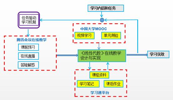 《线性代数》课程涉及的理论较多,在教学的过程中,对矩阵、行列式、线性方程组、特征值和特征向量、二次型等的相关计算能力训练非常重要。鉴于此,针对本课程的在线教学,设计中国大学MOOC、超星学习通和腾讯会议一体的教学框架,如图1所示。借助超星学习通平台开展在线教学内容所需要的资料传递需求,并充分利用中国大学MOOC中与教材匹配的精品课程视频和单元测验资料,培养学生的自学能力,然后再应用腾讯会议开展直播教学,进行重点讲解,课堂练习,讨论互动和答疑解惑。整个过程师生都必须明确每周的学习内容和任务,教师通过检查学习笔记掌握同学们的学习进度,通过批改作业来掌握学习效果,不断改善教学过程,提高教学质量。