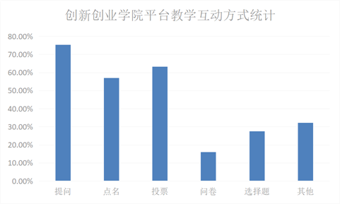 同比第五周教学,据各班级学委反馈,教师在平台上进行课程互动更加频繁,两周累计7000余次课堂互动,师生讨论累计4000多个。活动方式包括提问、点名、选择题、问卷、投票等多种形式开展。