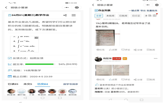 教师总体严格按照课表的时间上课,没有迟到早退现象。个别教师由于家庭等其它原因,已做好调课等后续程序和工作。教师已经熟练掌握各种平台直播或录播课程,取得较好效果。每节课,教师都有习题答疑、布置作业或思考题。大部分教师能和学生互动,并注重学生的参与和反馈。
