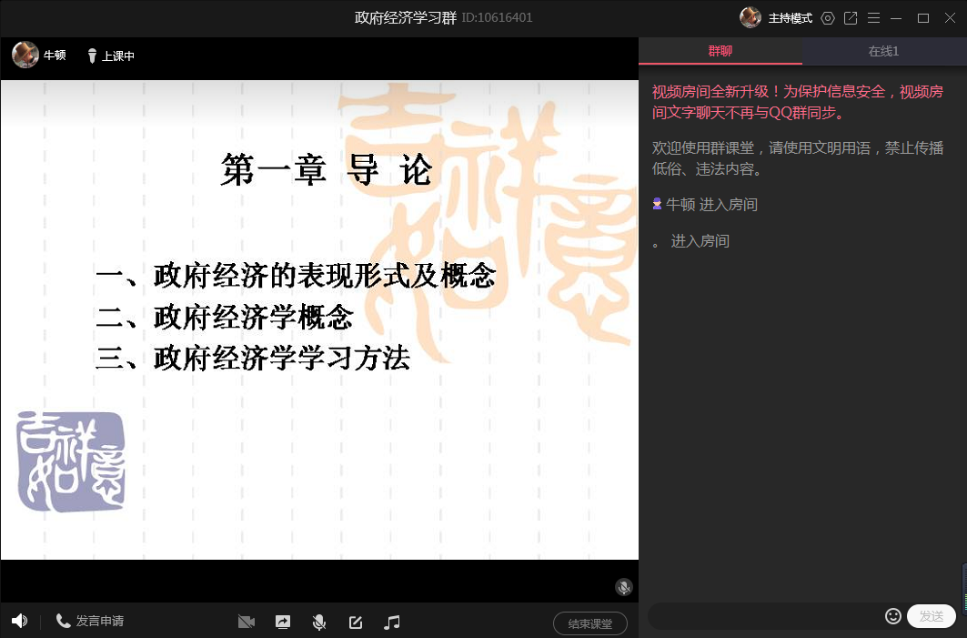 利用QQ群平台在疫情形势下新推出的群课堂功能(见图3)以及课程录制功能,可以让错过上课的或想重温课程的学生通过课程回放功能进行学习(见图4)。任课教师可以在平台上实时播放影片、演示PPT或者分享屏幕(见图5),并面向所有学生进行语音直播。此外,师生还可利用发言功能和群聊功能围绕教学内容进行实时提问、回答和讨论。由于在授课方式上比较贴近师生熟悉的现实课堂教学,群课堂教学有助于降低师生对网上教学的适应成本,缩短心理适应期,弱化物理距离的影响,拉近师生之间的心理距离。