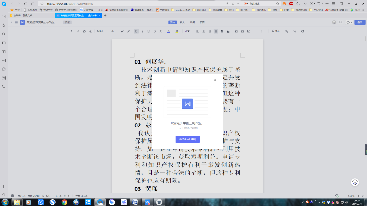 第三管,课后作业温故知新。通过布置课后作业,利用在线文档,每位同学可将自己的观点见解写在在线文档上,而其他同学亦可在文档中看到已发表观点的同学的看法,从而形成思想火花的碰撞,类似在课堂讨论过程中,能产生因“窃听”到其他同学的观点而给自己有所启发的效果。(见图8)