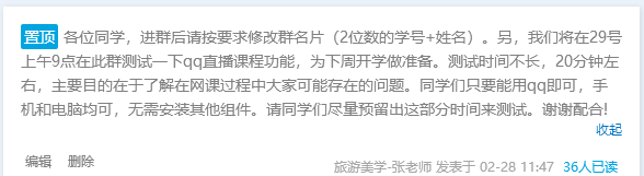 课程开始前15分钟,教师会提前进入QQ群课堂进行测试,调试好后在QQ群提醒学生及时进入课堂;学生进入课堂后,请学生端再次测试声像的通达程度。任课教师每次课程开始前都会进行网络考勤,确保学生的出勤率。QQ群课堂的在线列表(学号+姓名)功能可以一目了然地看到哪些学生迟到或缺勤。对于按时进入课堂的学生给予表扬,对于迟到的学生也会予以劝诫。
