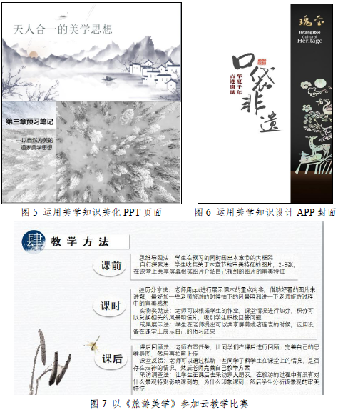 稳定的网络教学平台、准备较为充分的网络教学方案、网络课堂的有效组织,得到了学生的积极反馈。学生在过去几周的学习中已经树立了基本的美学认知,学习能力有所提升,并逐渐将所学审美知识应用于日常。如在做作业时,制作的PPT演示文件开始注重美化,关注演示文稿主题与背景的融合、意境的打造(图5);也有学生将所学理论应用于“互联网+”比赛的PPT制作和APP页面制作(图6);还有学生以本课程的相关内容作为云教学比赛的课题(图7)。