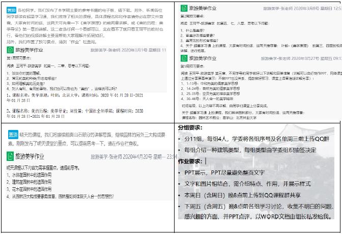 相同的教学容量,线上教学因网速或设备原因往往比线下进度稍慢,为弥补由此带来的信息遗漏,教师向学生推荐相应的网络课程自学,也可作为预习及拓展资料。由于目前尚未有能够覆盖本门课程内容的网络课程,所推荐课程由教师结合学生实际和具体授课进度进行甄选,不同阶段推荐不同的网络课程及其章节内容。因此学生有机会接触多学科的知识体系,视野相应拓宽。如在讲解美学基本原理时,授课老师经比较后向学生推荐《美学原理》、《美的历程:美学导论》的部分章节进行拓展;而在讲解园林景观审美时,向学生推荐《园林艺术概论》的部分内容进行拓展。