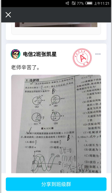 学生们能按时按量完成任课老师布置的作业。这两周作业的提交和批改情况来看,98%以上的同学能够按时提交作业(图5),并且作业干净整洁,步骤清晰准确。有个别迟交的同学,教师已单独和他线上谈话,敦促其改进。