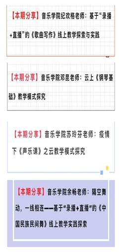 当教师费心费力把教学作品创作出来之后,最盼望的事情便是它能获得表演。如:歌曲写作课要求学生的作品最后都要演奏和演唱出来;舞蹈课需要学生将舞蹈动作演示出来,这在面授课堂上是非常便捷就能做到的。然而在网络课堂上,想做到五十几个同学同时表演并对比,就没那么容易了。不管哪个直播软件或会议平台,都无法做到几十个人的表演音色不失真,或者几十个人舞蹈动作同步进行,且信号又不延迟。因此作品不能完美地表演,的确是一件非常遗憾的事情。