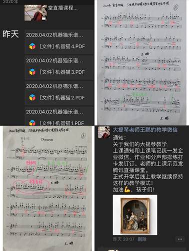 一场突如其来的疫情,让教育观念和方式得到彻底改变,所有师生都置身在一场教育大变革中。“停课不停学”的唯一方式就是网络教学。然而,所有音乐学院的老师都面临如何对这样一些特殊的课程进行网络化教学的问题,摆在老师们面前的是极大的挑战,同时可能也是机遇。抗疫期间,线上教学是新的挑战,音乐学院从教学实际出发,对教师服务的主体对象进行科学精准分类,增强了线上教学的针对性与可操作性。一是要充分考虑学期特殊性,对即将毕业的班级其课程量相对较少,教学工作任务可以考虑春季后线下教学来开展,线上教学平台主要解决研究生、非毕业本科生的教学任务。二是根据课程分类,开展线上教学。教师借助网络科技优势实现全课程在线上开展教学,并针对不同类型课程,教师设计成不同的线上教学方式,如钢琴、器乐、声乐、舞蹈这些技能性较强的课程,课堂互动性、示范性也较为突出,教师通过“腾讯课堂”结合“企业微信会议”和直播功能讲解课程内容的重点、难点、习题讲解、答疑问题、布置作业;理论课教“师超星学习通”、智慧树、雨课堂等通过PPT线上教师讲解、学习讨论、线上作题、线上答疑等教学手段,为同学们传授课程新知识。