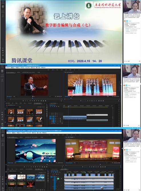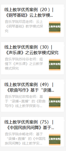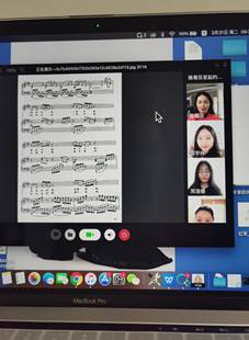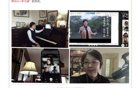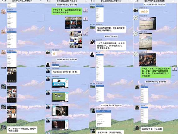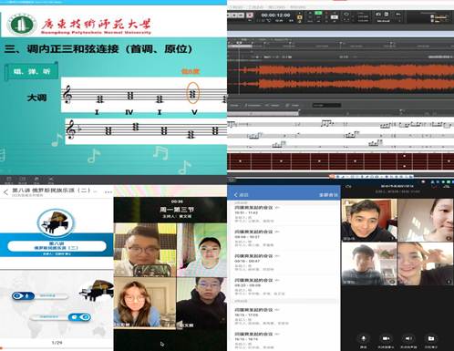 目前,音乐学院整个线上教学过程平稳,教师精神饱满,学生积极热情,达到了预期的课堂效果。学院共有四位教师的课程入选为“线上教学优秀案例”,如:邓昆老师:云上《钢琴基础》教学模式探究;苏玲芬老师:疫情下《声乐课》之云教学模式探究;纪欢格老师:基于“录播+直播”的《歌曲写作》线上教学探索与实践;余畅老师:隔空舞动,一线相连——基于“录播+直播”的《中国民族民间舞》线上教学实践探索,这些课例均得到学校教务处一致肯定。除此之外,音乐学院的教师们还制作了许多各式各样丰富多彩的课程,老师们通过教学平台施展着各自独特的魅力,也受到学院领导和师生一致好评。以下为教师开展教学图片: