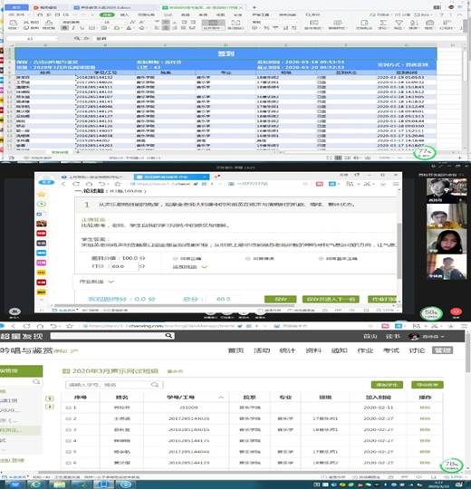 音乐学院强调,线上教学主要体现“以学生为本”的教学理念,注重学生能力培养、保证线上教学与线下学习的综合教学实效,突出线上教学特色,强调教学质量,做到教师在真正教,学生在认真学,高质量、高标准地推进线上教学工作。目前,音乐学院在校生710人(含研究生),线上学习的参与度高,上课出勤率达100%。学生线上课堂记录如下:
