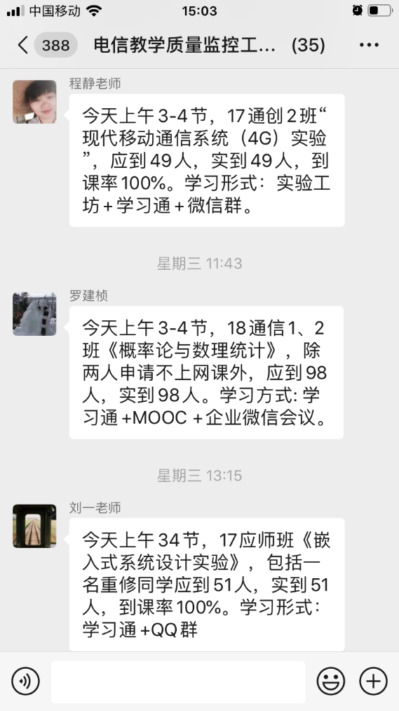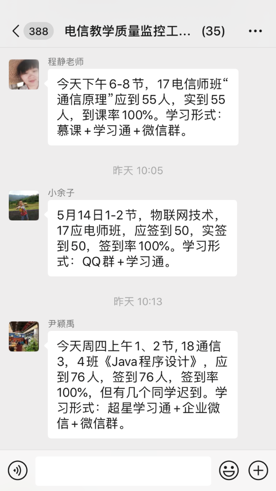 5月6日至5月15日,电子与信息学院共开展104门线上课程,累计23个班级参与学习,学生到课率基本100%。全院教师在线上课堂上坚持做到五个“有”:上课有课件、问题有讲解、师生有互动、课后有作业、线上有考勤,以此保障线上教学质量。为了便于学院教学质量小组掌握每日教学动态,授课教师课后在学院教学工作群汇报当日线上教学情况,针对个别学生迟到或旷课则由辅导员后续跟进,了解具体情况,督促其完成学习。经过两个多月的线上教学,全院师生都已经非常熟悉教学的相关流程,熟练掌握了相关线上教学平台的功能和使用技巧,课堂上师生间的交流互动也变得更加流畅。