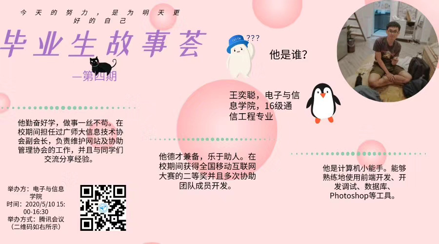 除了线上教学外,电子与信息学院还开展了丰富的线上主题活动,如5月10日下午,在企业微信上举办了第四期“毕业生故事荟”活动,此次活动的分享嘉宾是2016级通信工程专业的王亦聪,活动由辅导员韩琼老师主持。疫情期间,电子与信息学院坚决贯彻习近平总书记提出的就业优先战略,把毕业生就业工作放在学院工作的重中之重,采取多种举措帮助毕业生实现更高质量和更充分的就业。通过组织优秀毕业生分享交流,提高应届生就业能力与水平,为非毕业生树立榜样,激励他们勇往直前,未雨绸缪,提前为自己的未来做好充分准备。