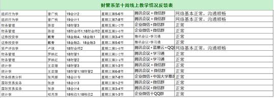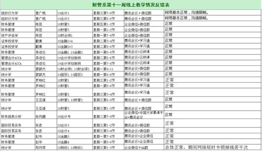 财经学院线上教学开课50门(含管理学院的经济学、会计学、微宏观经济学3门课程),除会计信息系统由于需要使用软件继续延迟外,其余课程全部按要求开课。使用腾讯会议44门次,腾讯课堂30门次,学习通25门次,企业微信30门次,慕课8门次,QQ群课堂6门次,钉钉4门次,SPOC 1门次,录播2门次,学习强国视频 6门次 云班课6门课。由任课教师、教学信息员、系主任、学院督导组组成的四层教学质量保证体系继续履行督导职责,任课老师课中严格管理,继续通过各种灵活方式监督学生课堂学习,教学信息员按要求及时反馈学生学习具体情况,系主任、学院教学督导按要求完成听课任务。