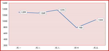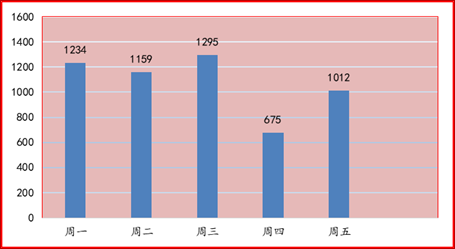 全校第十二周至第十三周共开出5363门次课程。其中,周一开出1234门次课程,周二开出1159门次课程,周三开出1295门次课程,周四开出675门课程,周五开出1012门次课程,见图6所示。