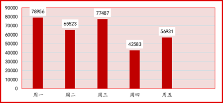 第十二周至第十三周全校共计325688人次学生开展线上学习。其中,周一至周五分别有78956人次、65523人次、77487人次、42583人次、56931人次的学生开展线上学习,见图10所示。