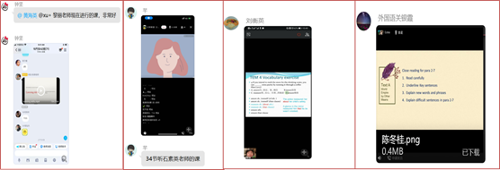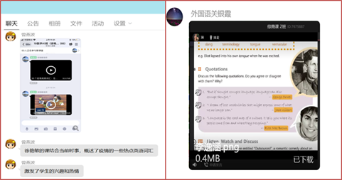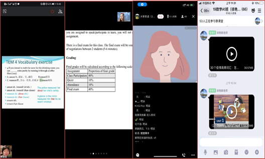 教师较多使用腾讯(QQ和腾讯课堂)、企业微信或Zoom等,不管是用语音通话还是视频通话,都非常清晰,较少卡顿,课堂教学进展流畅。这些平台比较有利于师生互动,尤其适合互动性强的外语教学。