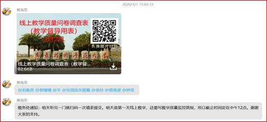 为了加强线上教学质量监控与督导,学校建立了多维度、多角度、多层次、全方位的教学督导制度,要求每周校院两级教学督导至少每周听评课一次,督导提前加入到线上课堂的平台或工具,实时参与,了解教师的教和学生的学的状态。