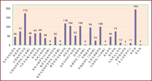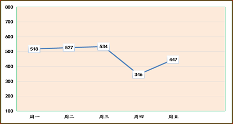 第十二周至第十三周全校各教学单位共计开出1514门课程。其中,周一开出518门课程,周二开出527门课程,周三开出534门课程,周四开出346门课程,周五开出447门课程,见图4所示。其中,体育部开出体育选修课194门课程,计算机科学学院开出专业课程173门课程,见图5所示。