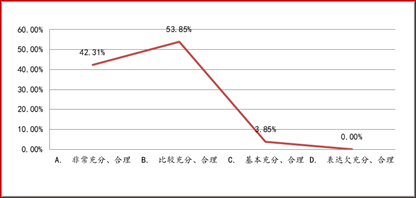 有42.31%的教学督导认为本次座谈会教师和学生反馈的意见和非常充分合理,有53.85%的教学督导认为比较充分、合理,说明本次座谈会师生都非常重视,反馈教与学中存在的问题及改善的意见和建议,96%以上的督导都认为座谈会,师生都积极参与和发言,座谈会达到了非常好的效果。