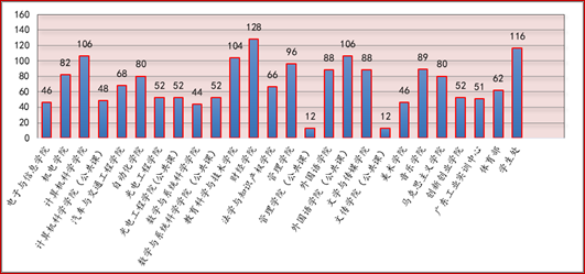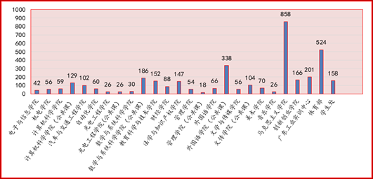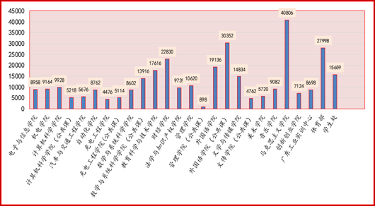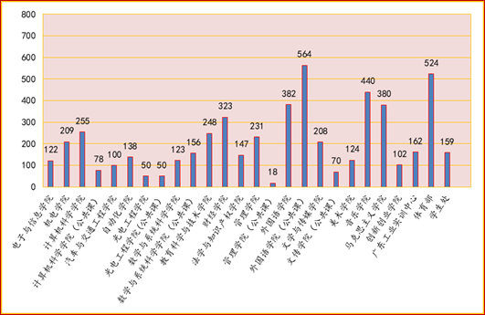 其中,外国语学院承担49488人次学生的教学任务,马克思主义学院承担了40806人次学生的教学任务,体育部承担了27998人次学生的教学任务,见图11所示。
